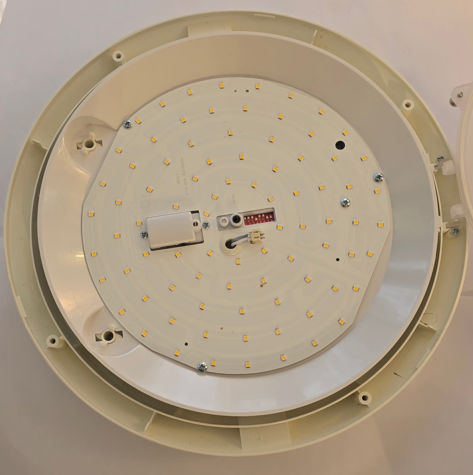 🔹 Type : Plafonnier LED avec capteur de mouvement, capteur crépusculaire et batterie de secours