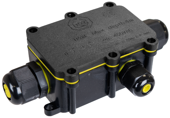 Avec borne de connexion incluse. 4 pôles. Jusqu'à 2,5 mm². 24A-250V~. 3 presse-étoupes M20 avec joint en caoutchouc pour câble Ø 4 à 8 mm, 3 joints pour câble Ø 9 à 12 mm, et 1 bouchon. IP68 (Profondeur maximale 4 mètres). Fixation externe. .
