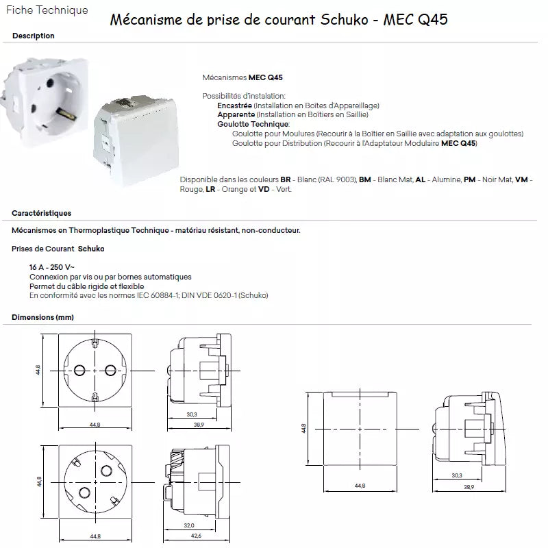 Fiche Technique – Prise de Courant Rouge Française inclinée à 45º avec Enclavement 45116 SVM QUADRO45 EFAPEL