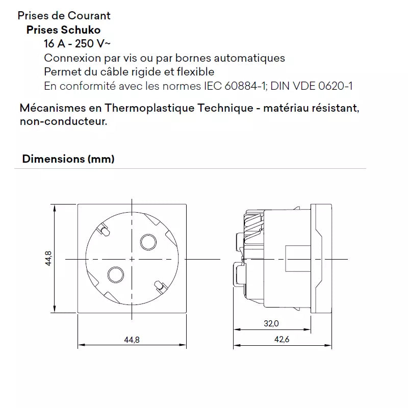 - Normes : Conforme aux normes NF C 61-314 (norme des prises de courant en France) et CE